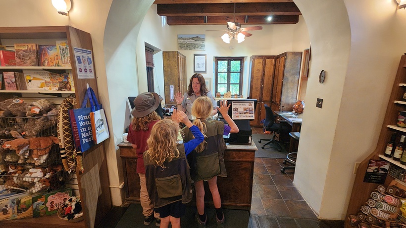 After working on their books for a bit, we took the kids into the museum to do the practical portion of their Junior Ranger activities. The church structure is visible in the backgound.