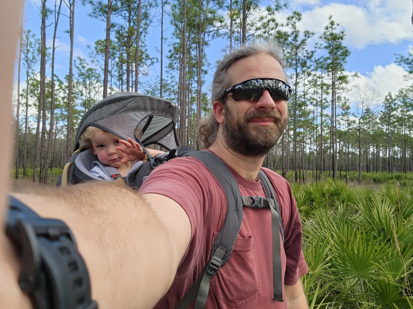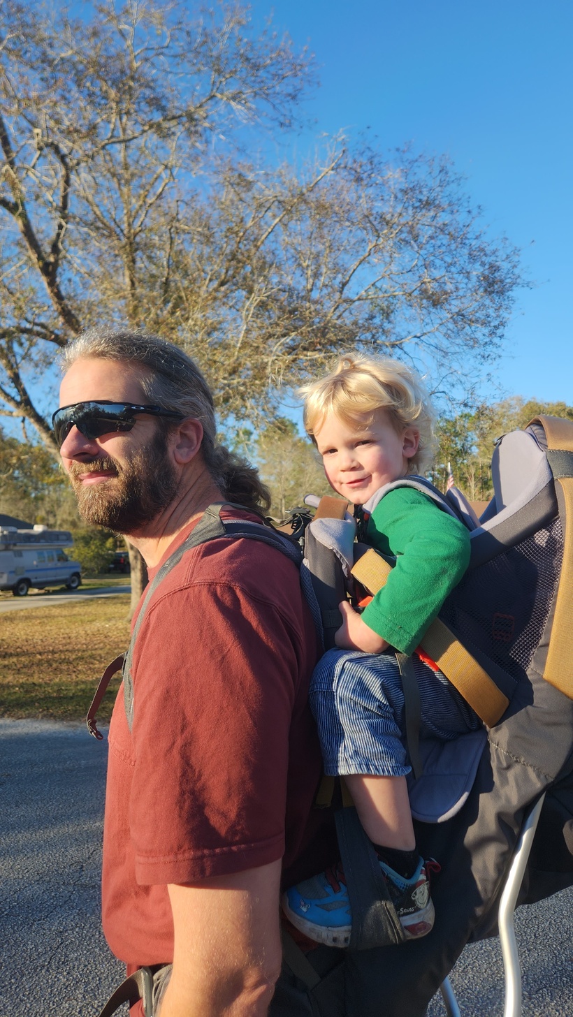 Testing out the kid carrier. Alan ordered a new carrier for the trip, designed for the bigger kids. It was quite comfortable, a Kelty PerfictFit ELITE.