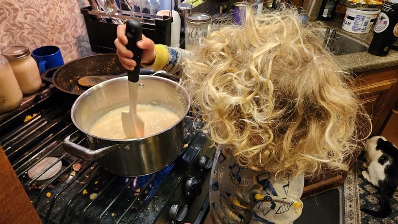 Evan helps make breakfast. Pancakes are one of his favorite things to make and eat!