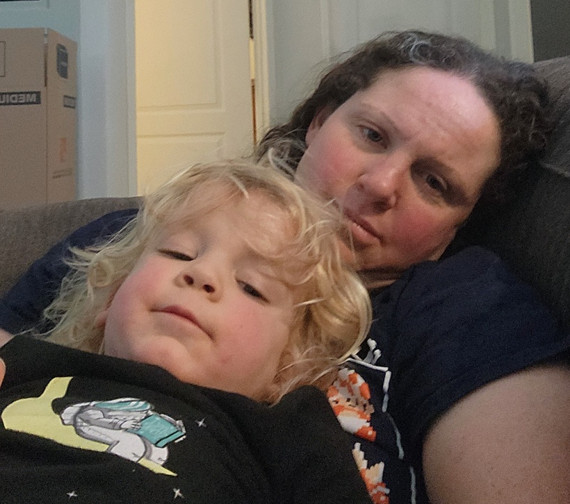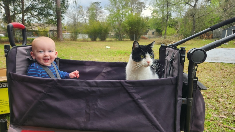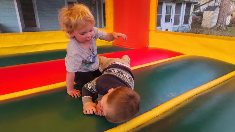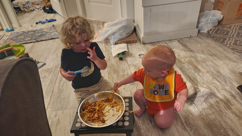 Ducky holds onto Evan, sad, because he doesn’t want him to stop playing with him outside.