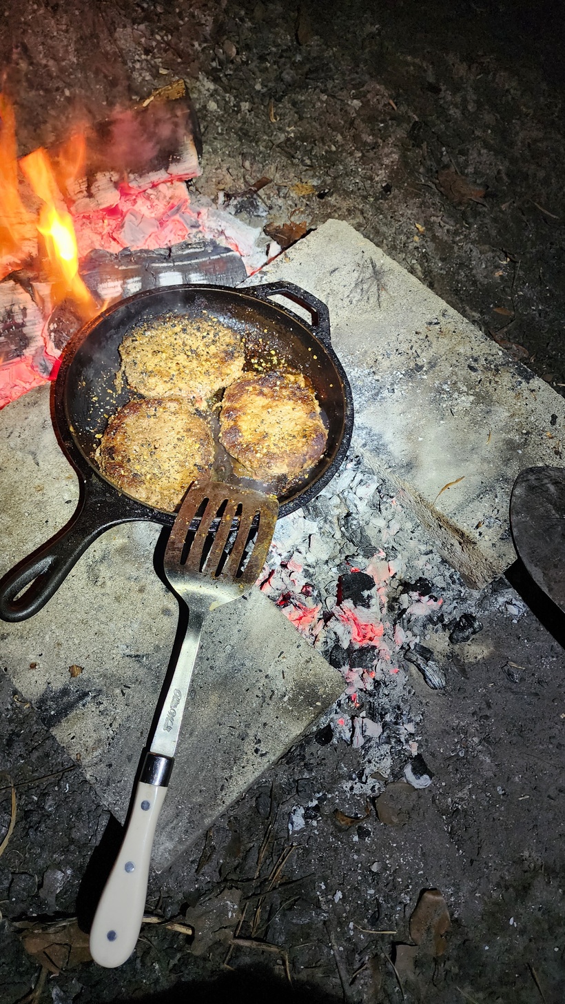 Jarek cooks dinner over a fire for one of his WEBLOS activities. Not quite the same as on a stove.
