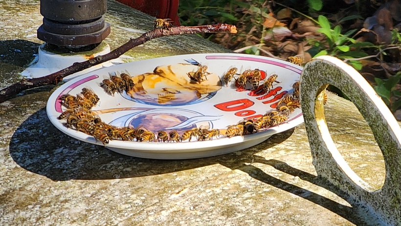 We left a plate out (shocked face!) and came to find the bees our neighbor keeps were drinking the water the next morning after a rain.