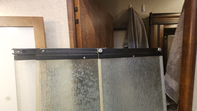 After arriving at our camp site, I set up the RV and went to go fix the bathroom shower door. One of the screws had come out of the track wheels and it fell of the track. Fairly easy fix, but to do so involved lifting the heavy glass doors out and reseating them in the track.