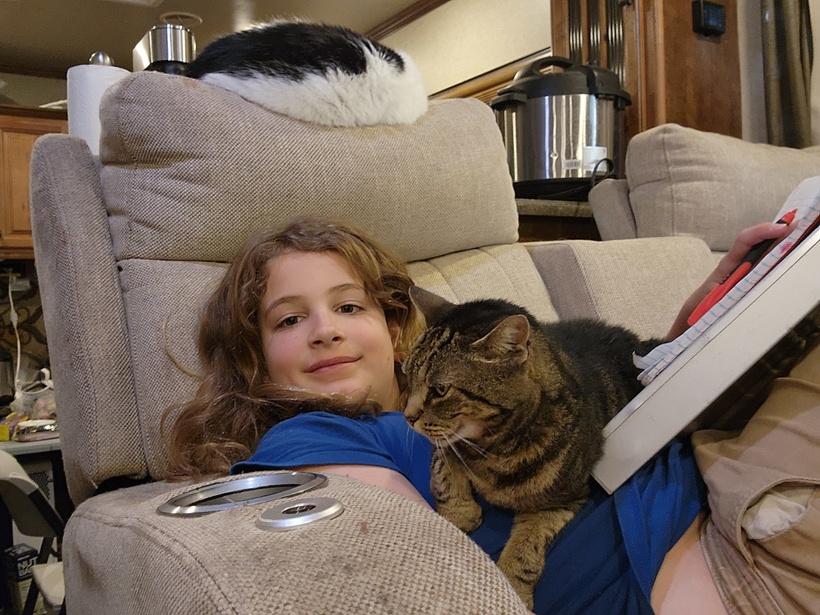 Jarek get some cuddle time with Firefly and Gambit snoozes in his favorite spot on my chair.