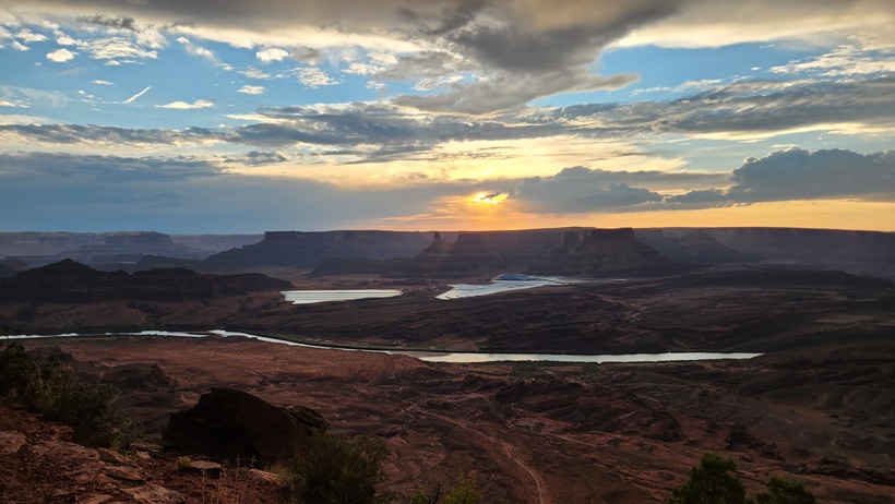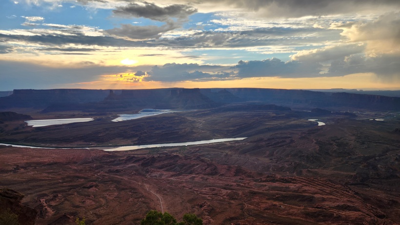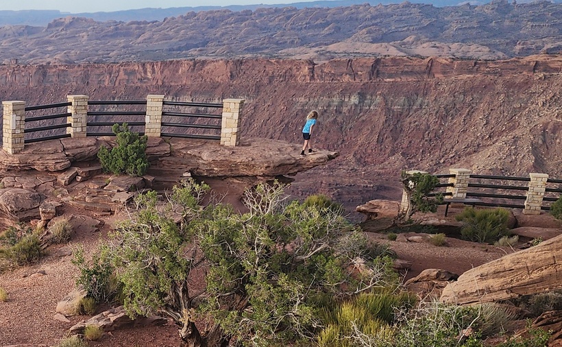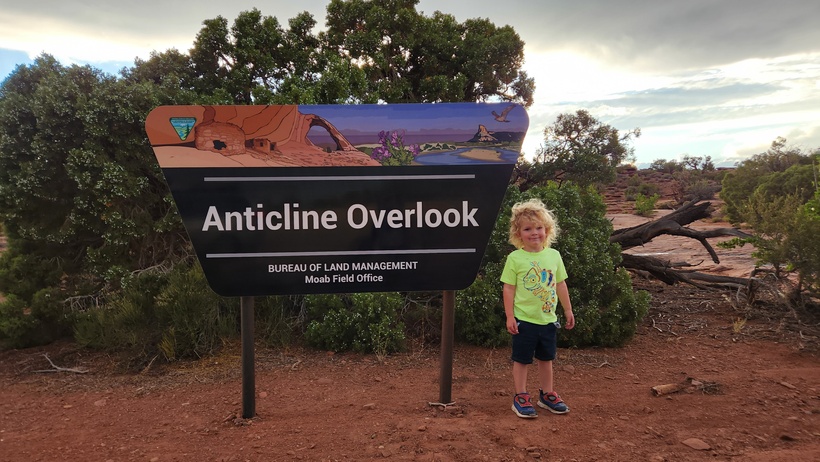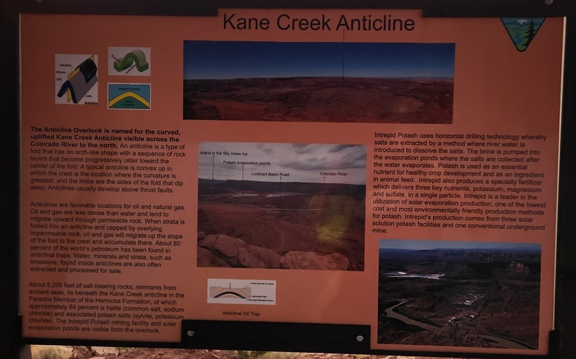 “Anticline overlook is located 31 miles from US Highway 191. Sixteen of those miles are on a graveled, highly improved road. A walkway leads to an interpretive display and benches. The overlook faces north, and offers views of Dead Horse Point State Park, the Colorado River, and Kane Creek Canyon.”