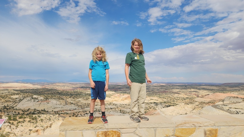 Jarek and Evan pose for a picture with the Escalante Valley behind them.