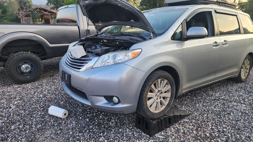 Alan did some maintenance on the van, an(other) expeditionary oil change! Part of the challenge of a trip like this is staying on top of the maintenance requirements for the cars.