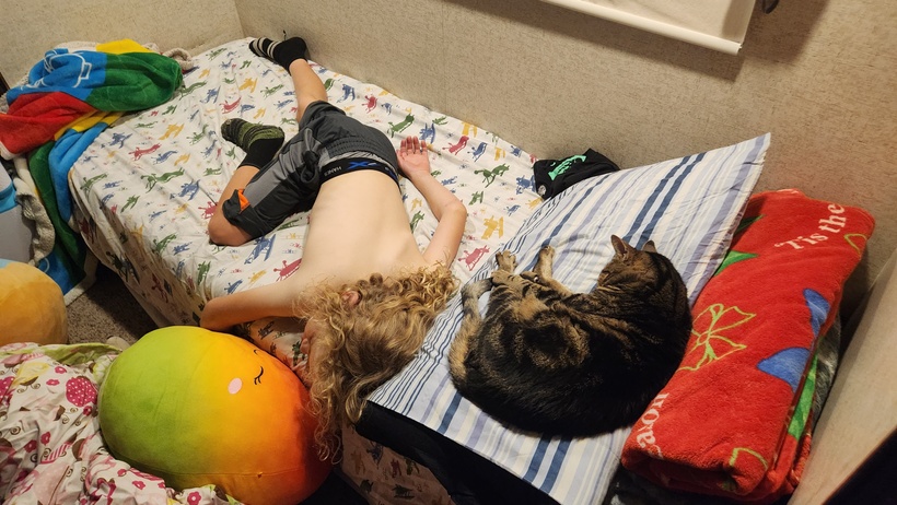 After our adventures, we had a rest day. The kids built themselves a fort using folding chairs and blankets. Here, Evan plays with Randal.