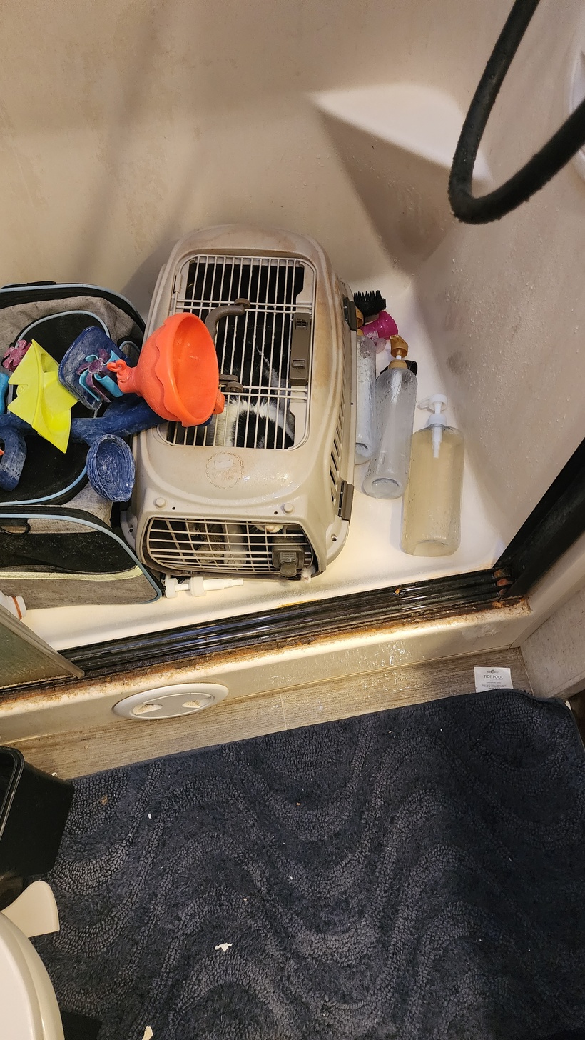 We had taken to putting Gambit and Gizmo into the shower when we travel. They were making some messes, so we figured that at least if it’s in the shower, it’d be pretty easy to clean up.