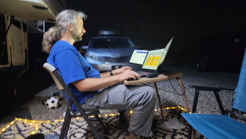 Taking advantage of the cool night, Alan gets some work done on the laptop.
