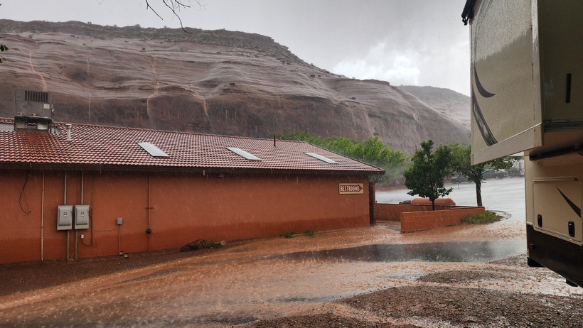 I got everything parked and set up just as the rain began to fall in sheets. I grabbed Ducky and tossed him in the RV while I finished getting things situated. You can see all the waterfalls on the mountain side are active now.