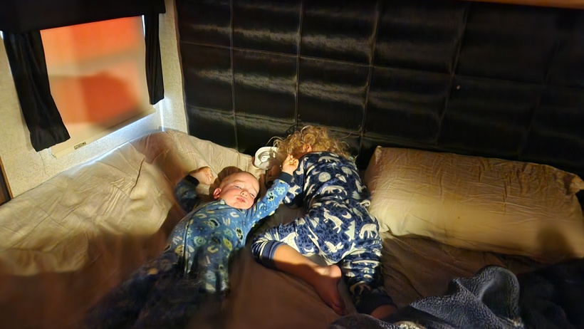 Two little sleepy heads in bed. Garrett will sometimes sleep in his own bed, but usually will wake up around 6 or 7 in the morning and come to our bed. Randal will wake up somewhat randomly throughout the night for another nursing session.