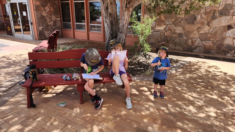After they finished their Junior Ranger books, we drove out to Horseshoe Bend. This was a short hike from the parking area, about a mile or so. It was very hot and we took our time. It was a nice view of the river and the Bend. We were able to see some kayakers or rafters setting up camp on the beach below us.