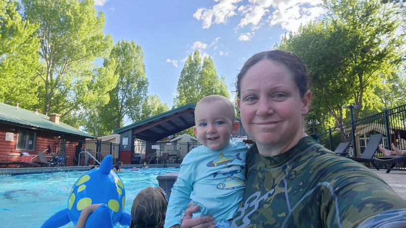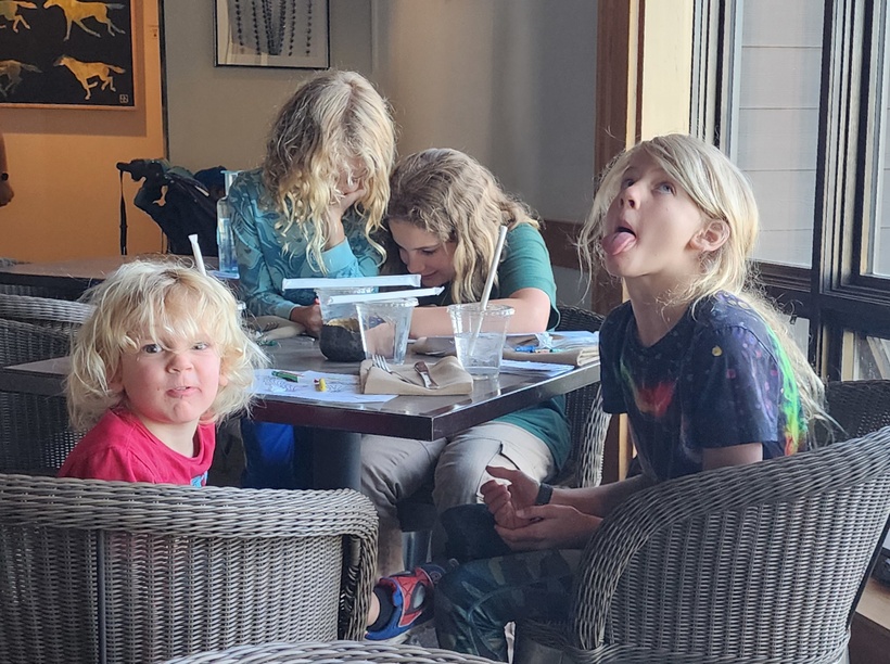 A hungry Randal nibbles on Arya’s hands while the kids wait for their food. After a decent lunch, we returned to the campground and the kids went swimming.