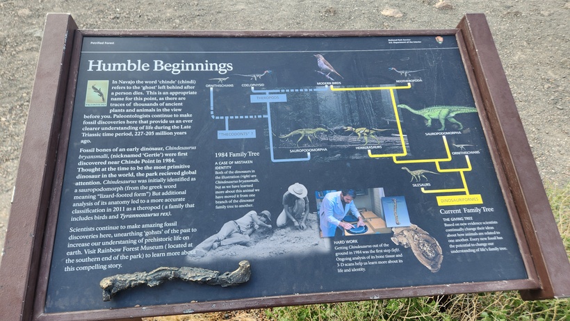 The crew posing on a petrified tree laid out in front of the visitor center building.