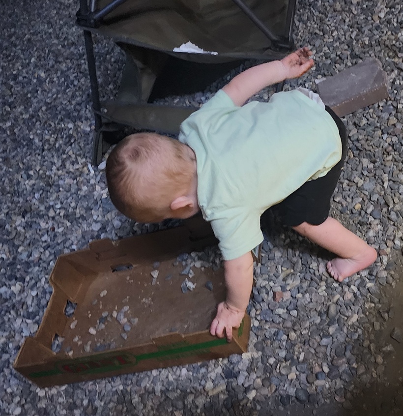 Randal does his new favorite thing – putting things into things. One of our best toys – a cardboard box and some gravel rocks!
