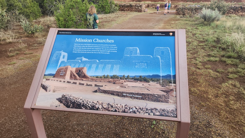 An informational sign showing the previous structure and what remains of the mission church. The mission church had several kivas which were incorporated on the church grounds. This was unusual because most mission churches did not have kivas on their grounds. This was also one of the pueblos that was successful in revolting against the Spanish rule.