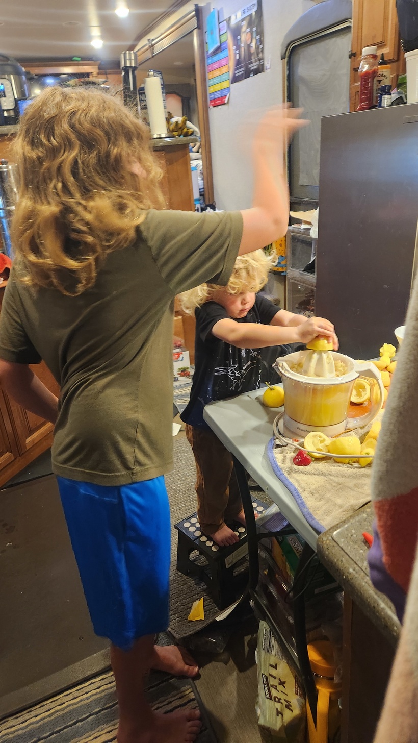 Meanwhile, back at the RV, Jarek and Garrett process lemons to make lemonade.