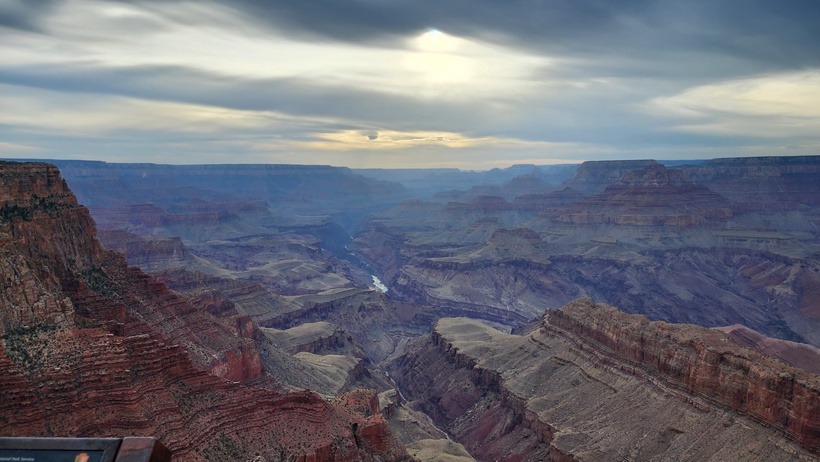 We took the scenic drive around the South Rim and got some nice views at sunset. Here, you can see the Colorado River reflecting the sunlight.