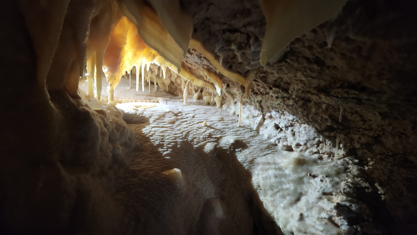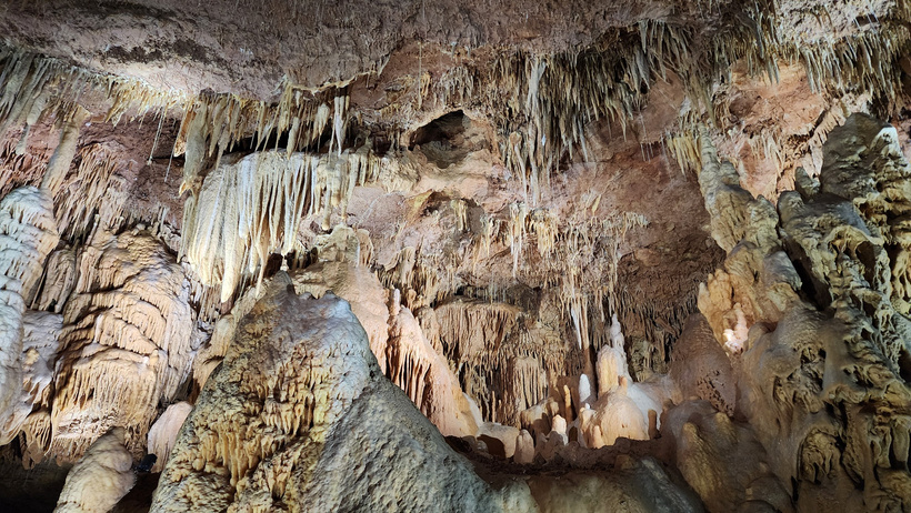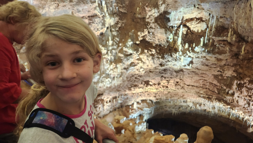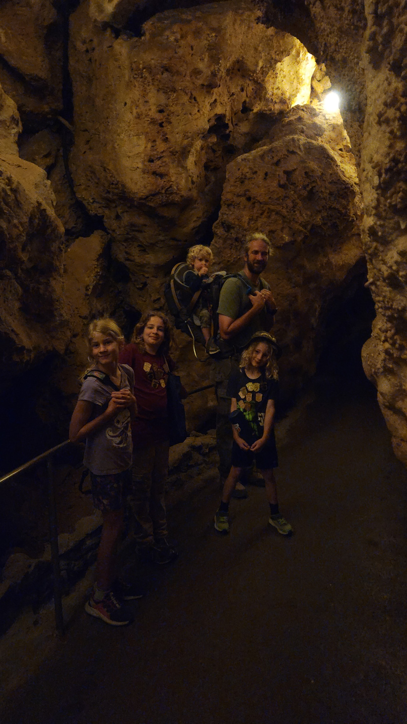 The pull-up and diapers were checked, straps checked on the kid backpacks and we waited for our noon start time. After pictures and a safety briefing, (no touching the caves you filthy humans and no getting hurt) we headed through the double doors and were immediately in another world. The cavern was warm and moist. There were beautiful formations everywhere. Flowing cave curtains, soda straws on the ceiling, stalactites, stalagmites and columns, this room had it all.