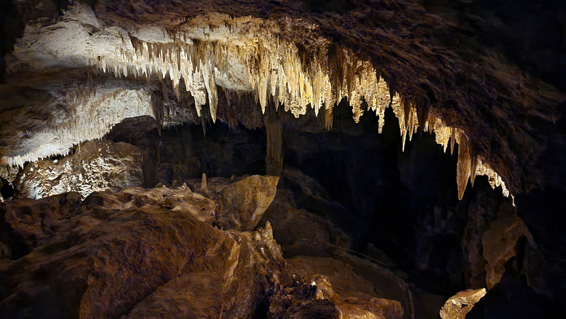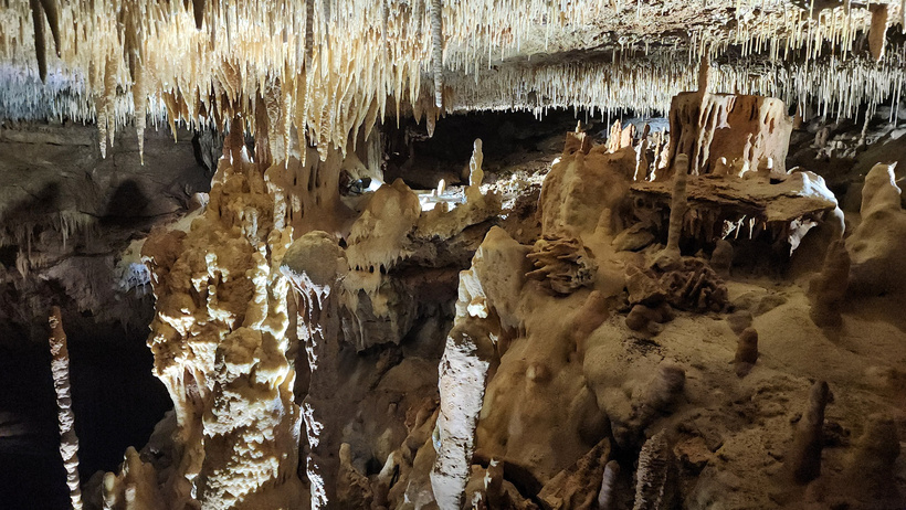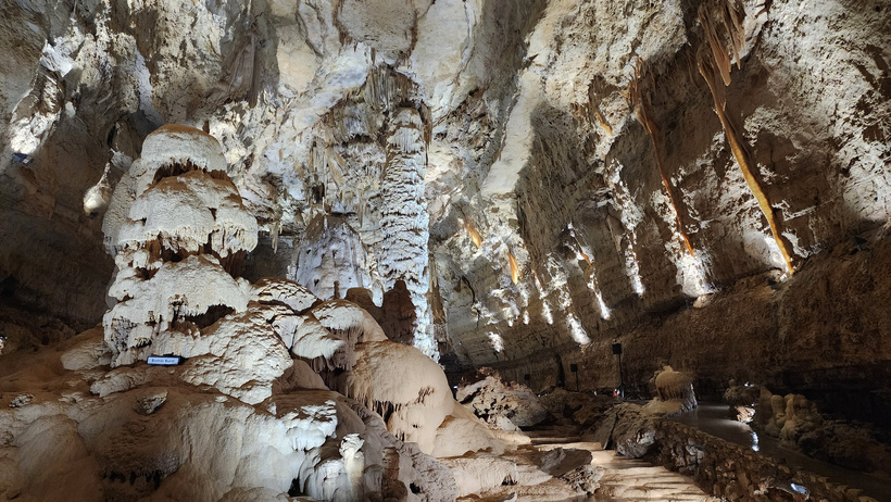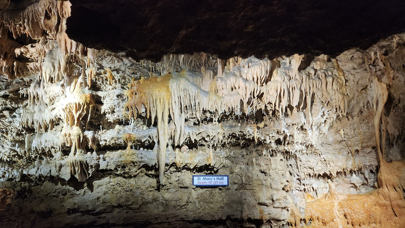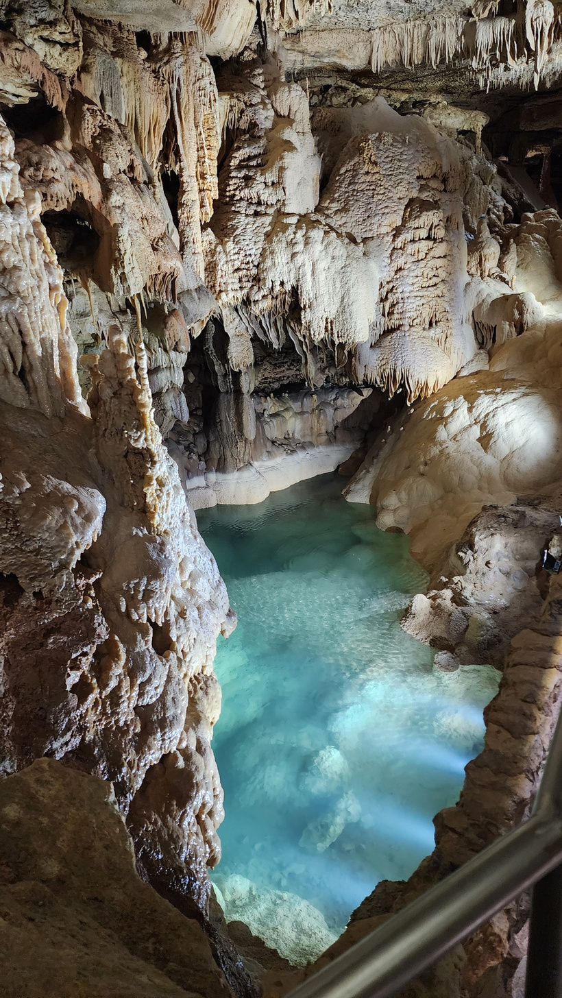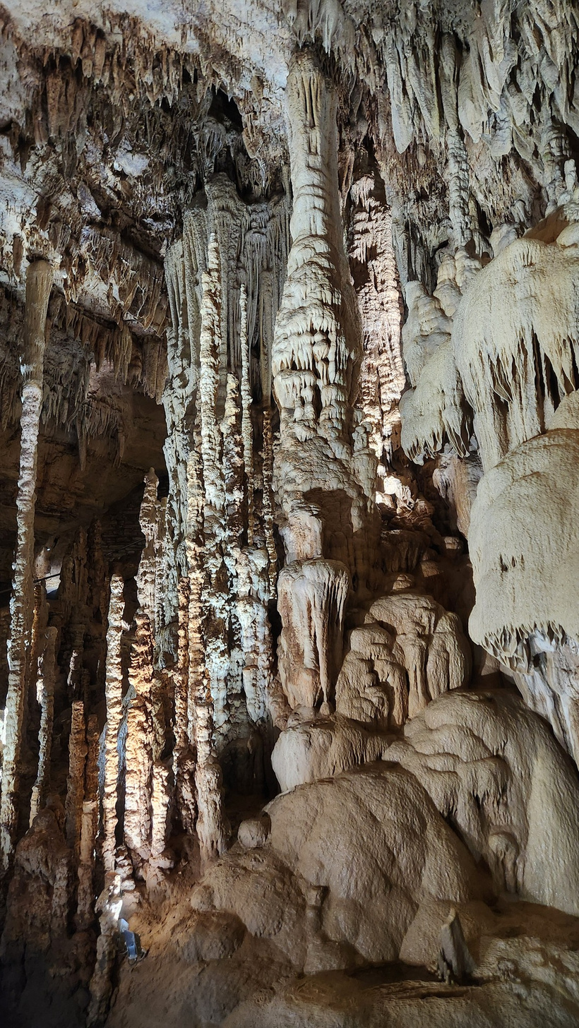 The stairs led downward around a central area covered in flowing cream colored rock. The guide explained this cavern formed when the water receded. and the limestone ceiling collapsed as it lost the support of the water. The calcium deposits over the fallen ceiling debris indicated that it was a stable chamber. The rock formations grow at a rate of one cubic inch per hundred years and there were a good number of tall formations on the rubble. This cavern was named the Jeffery Cavern, a combination of the first letters of the names of those who discovered it.