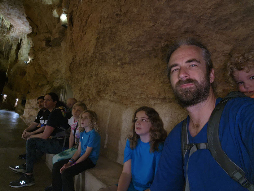 Another amazing day: we left the RV precisely when we meant to. No poopsplosians, nothing forgotten, lunch packed, nobody crying. We drove 45 minutes to Natural Bridge Caverns to take their Hidden Wonders Tour, a new cavern that opened last year. Alan, my mom and I had taken the Discovery Tour sometime in 2008 when we lived in Corpus Christi. It was definitely a good tour, but a new cavern sounded too exciting to pass up.