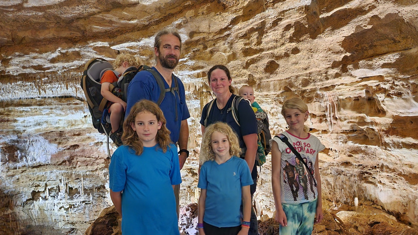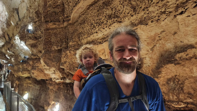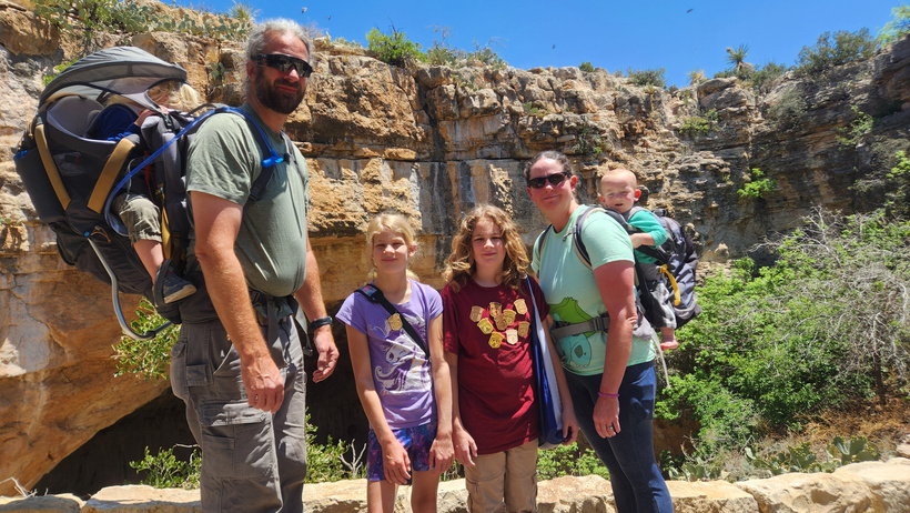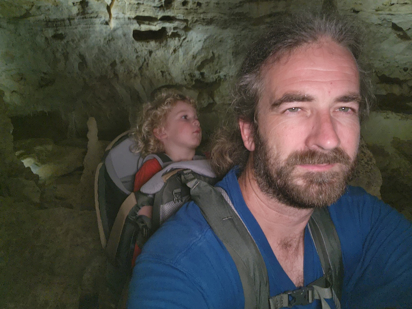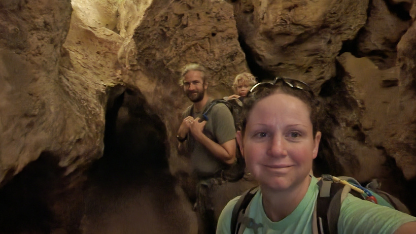 Stopping before this passage for a family shot. I (Alan) would have to crawl on hands and knees to get through this with Garrett on my back.