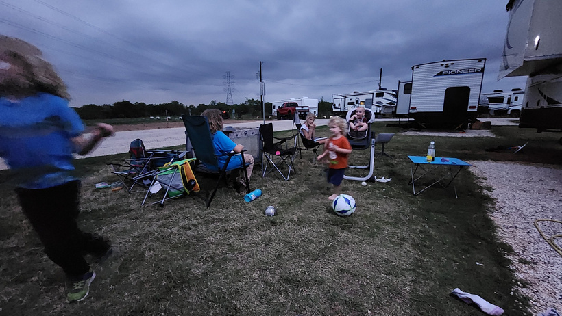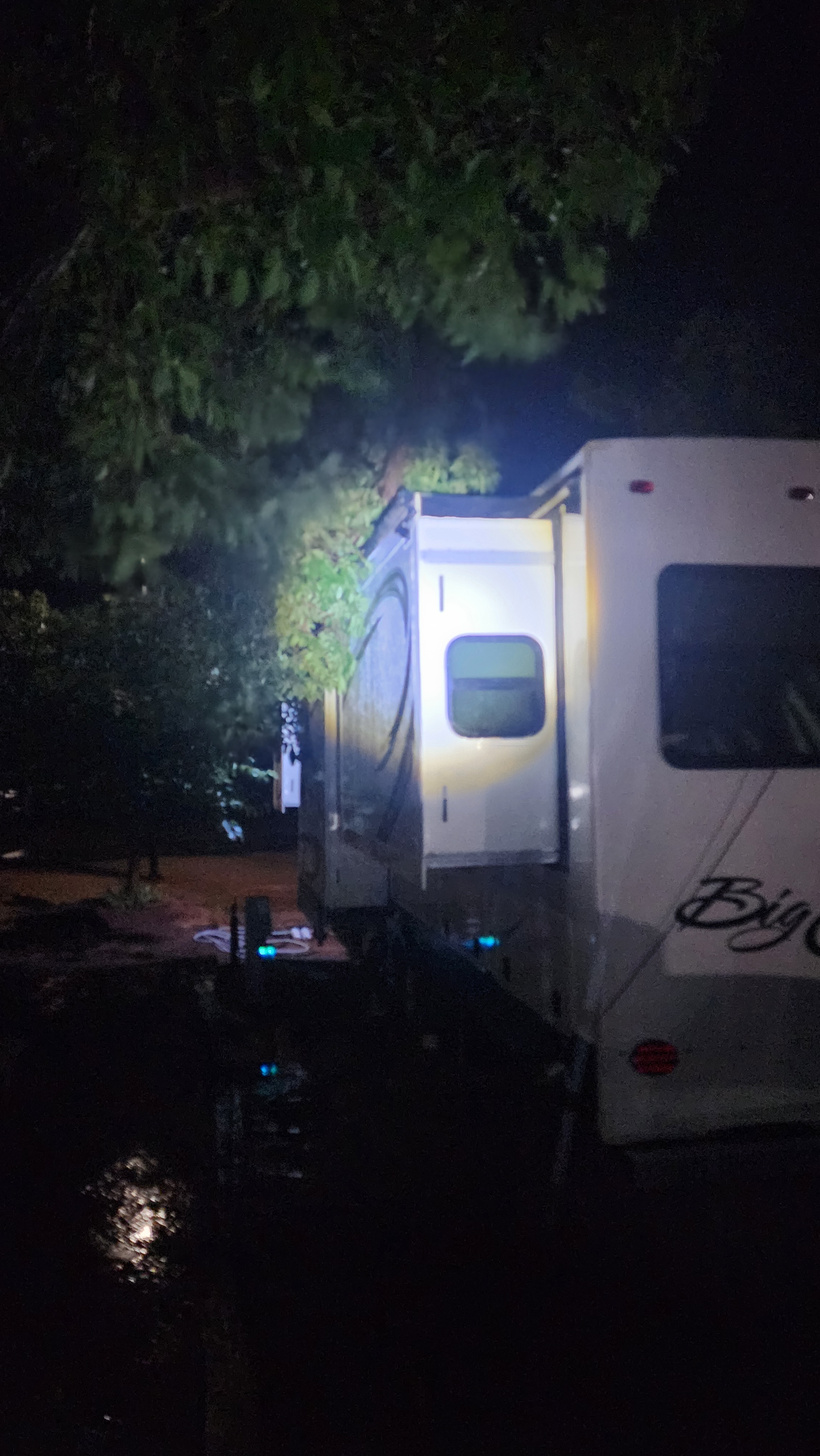 Later at night, we were hit again by another batch of storms. We heard some rubbing noise, sometimes sounding like a baby cry. Only the baby wasn’t crying. I went out in the storm to investigate. Apparently I had parked too close to one of the branches, shown in the above photo. It wasn’t that it was hitting the RV, but it was above the bedroom slide out and when the when blew strongly, it would move the branch and rub on the top of the slide. Not much to do near midnight, so I adjusted the RV tilt so the back end was down away from the branch as best I could get it. I moved the rig to a different spot in the site away from the branch the next morning.