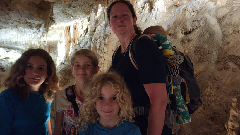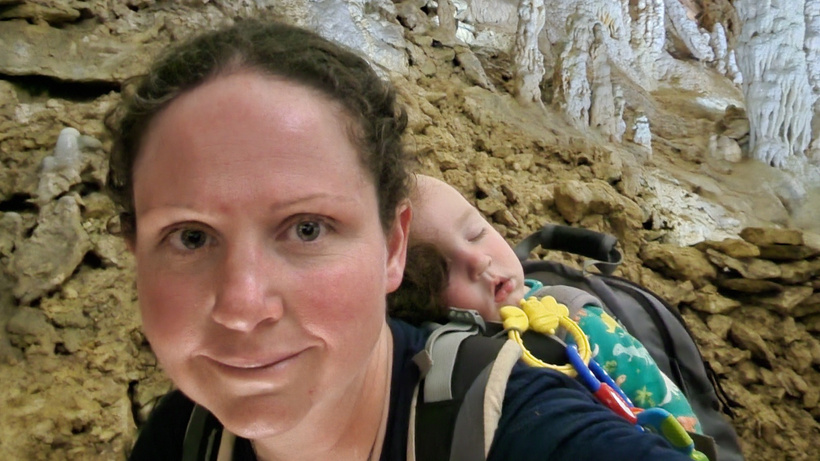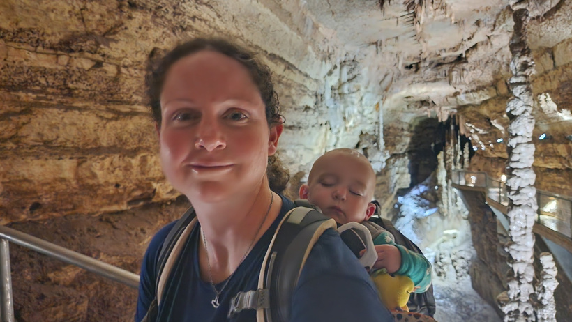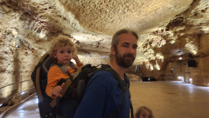 Well, the cave exploration part of the tour ended there, but we got to ride the BAT back to the surface. The BAT, a Belt Assisted Transport similar to the moving walkways at airports, would carry us up the incline to the surface. After a five minute safety video, (I’m not kidding, people need to be told how to step on a moving walkway. My hope for the future of humanity took another hit today) we bravely stepped on and began the five minute journey back to daylight. I think my foot would have hurt less had I just walked up the ramp. The incline meant there was constant pressure on my sore heel. There were a couple of points where the belt did seem to be trying to shake us off as it passed over some rollers. I give the BAT two out of five stars, would not do again. Alan grabbed our gigantic lunchbox from the car and we sat down near a school group at a picnic table. A very polite and sweet young lady said she was sorry to interrupt our lunch, but she had to tell us we had a very handsome baby. He hadn’t bitten me yet today, so I agreed with her and thanked her for the compliment. The kids chowed down on their sandwiches, oranges, and Izze’s. Randal and I shared cottage cheese and a banana, then he wanted an orange, then he wanted my fizzy water. I finally passed him off to Alan so I could have my peanut butter crackers without having to share. None of the other babies needed food like Randal does, he’s such a little beast. Hauling him around in the baby backpack was a great workout. My poor foot hated me for it, but I gotta lose weight somehow.