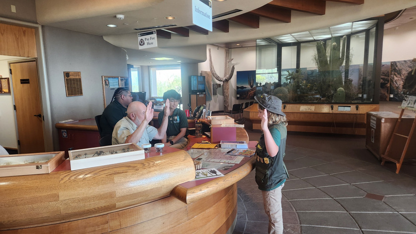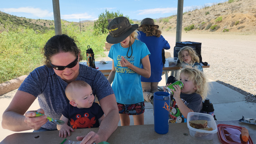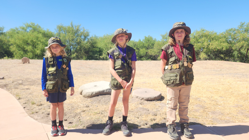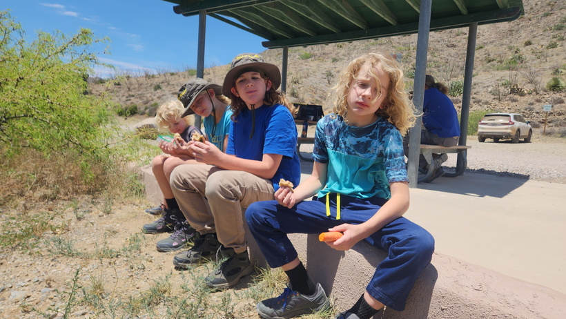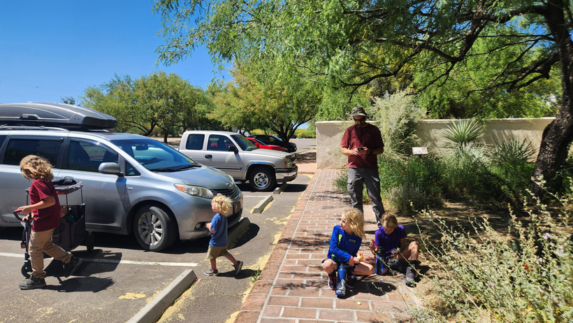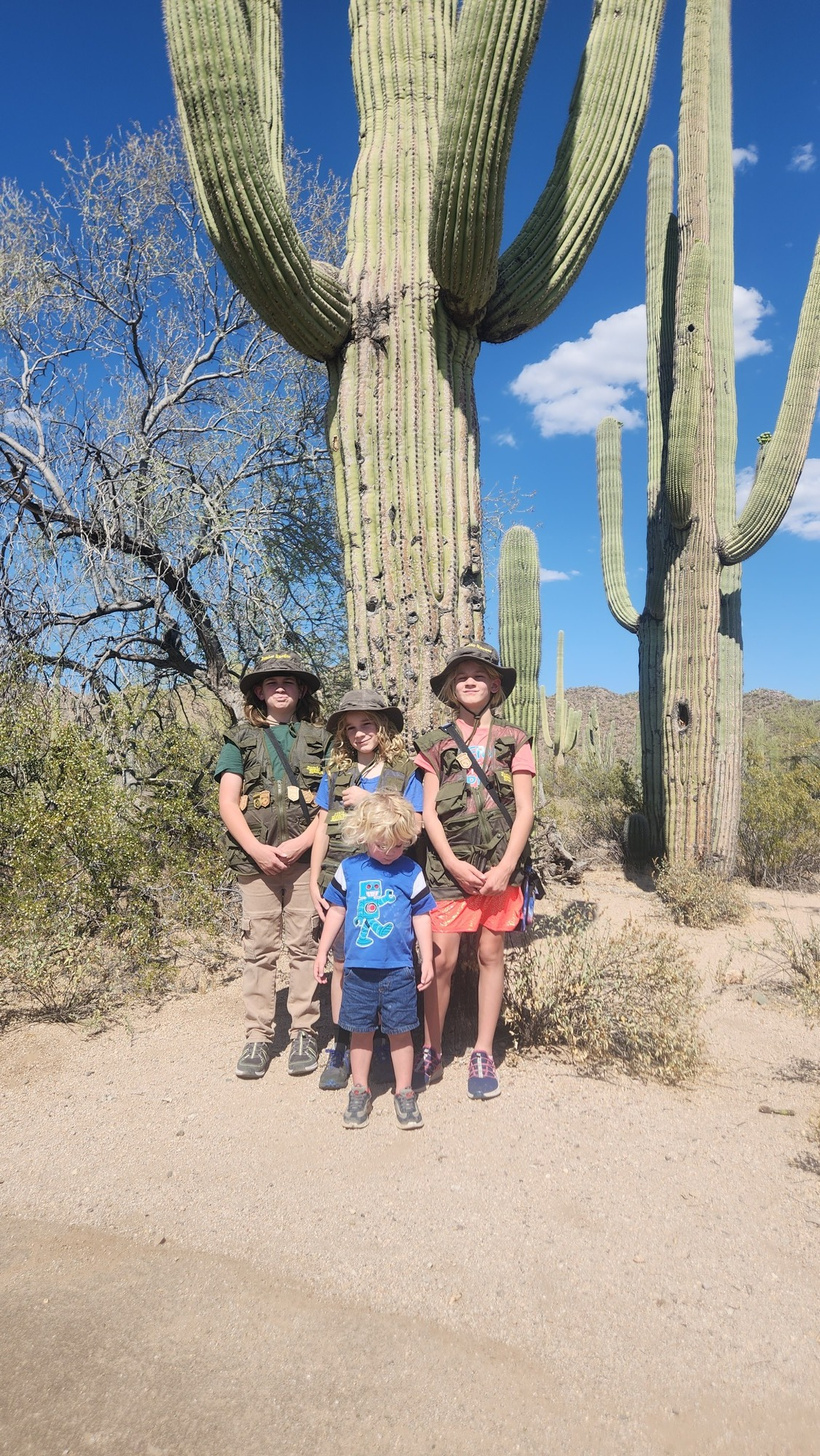 We realized we did not have enough time to drive into town and turn in the kids’ books at the BLM office, so we headed to Saguaro National Park Visitor Center at Red Hill. We printed out the Saguaro NP books the previous evening and Jarek had finished his. Arya and Evan were less interested and scattered their pages across the house, helped by Garrett and Randal. Picking up all the pages left me reconsidering the wisdom of printing them off beforehand.
