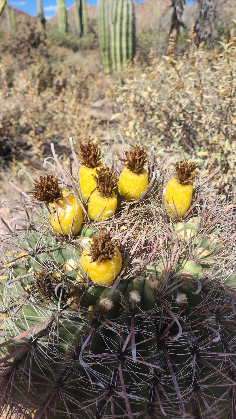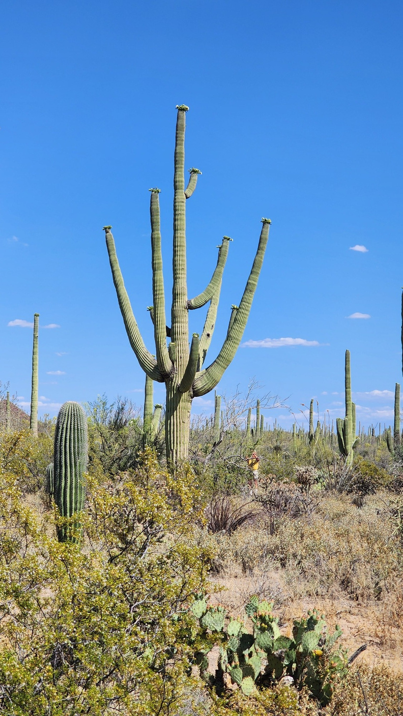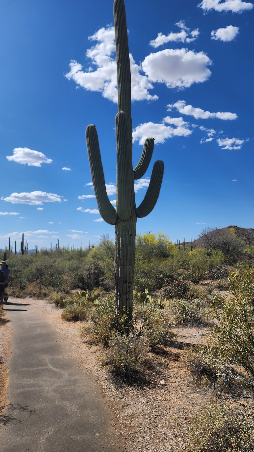 We walked quickly between the information placards and learned to tell the difference between palo verde, acacia and mesquite trees. A zebra lizard skittered across the trail and hung out long enough for a picture. We also saw baby saguaros underneath their nurse trees. Each saguaro produces 20-40 million seeds in its lifetime, but only one or two make it to adulthood. The only way they will grow is if a seed finds its way near a tree that shelters it in its infancy. We saw a few saguaros that now loomed over their nurse trees. Those trees were probably wishing they’d kicked their kid out a long time ago, the poor things.