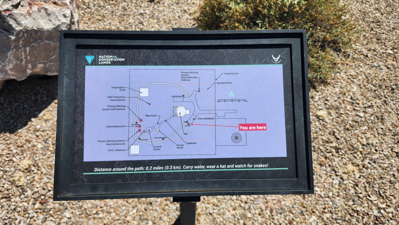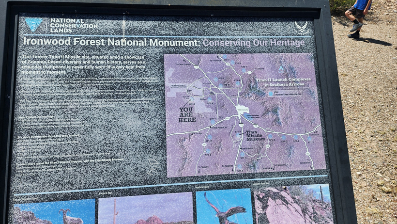 After driving 50 minutes and a couple of stops and wrong turns, we reached the Titan II Interpretive Site. There were 18 missile sites spread out across the desert south of Davis-Monhan Air Force Base. They were decommissioned in 197x and the bunkers destroyed. The site had a quarter mile gravel path around the former silo with sun faded signs detailing the layout of the complex and the explaining how it was constructed. The kids got an introductory lesson on the Nuclear Triad one of the worst jobs in the US military. Living in a bunker and running drills to end the world is not my idea of a good time.
