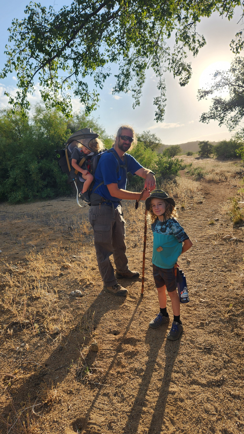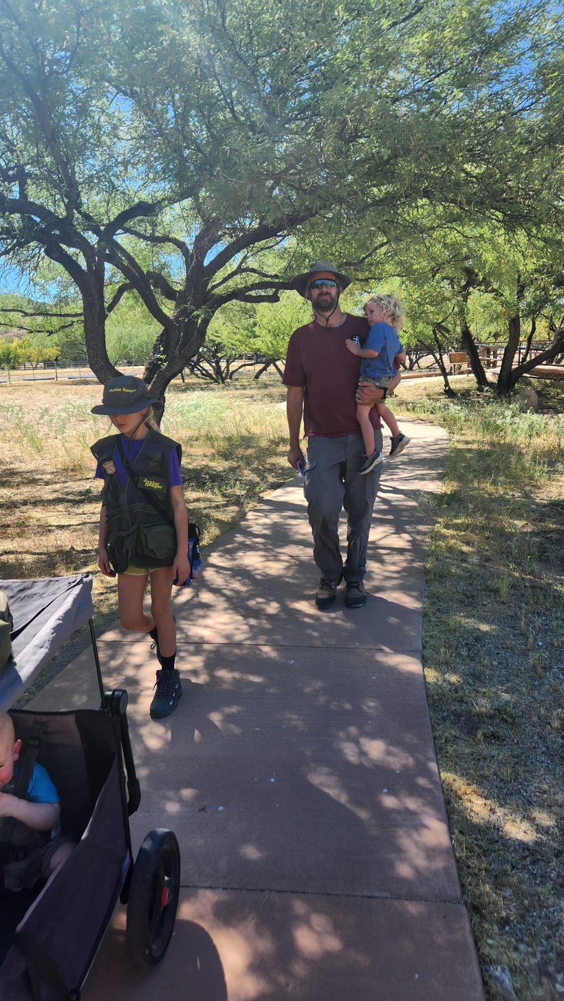 The children got their Junior Ranger gear, grabbed their water bottles, except for Evan, who had once again left the house without one, and we all hit the trail. The trail was a smooth, asphalt path on completely flat ground. The saguaros were huge and most had multiple arms off their main trunks. They don’t start to grow their arms until they are at least 60 years old, so we had some real old geezer cacti out here. We passed a dead saguaro and Jarek was excited to see its inner structure. A saguaro is supported by tall wooden ribs around a central wood core. The dead giant had been at least 20 feet high and looked like it once had a diameter of two feet.