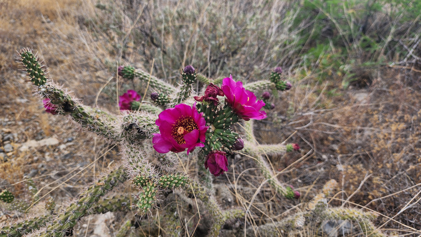 Beautiful desert cactus flowers greeted us along the trail. As we went down the trail, we pass a fault where the geology and plant life changed rather dramatically to a more forested area.