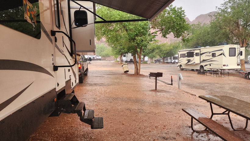 I got the rig set up in our spot and was finishing up the connections when the rain drops began to fall.