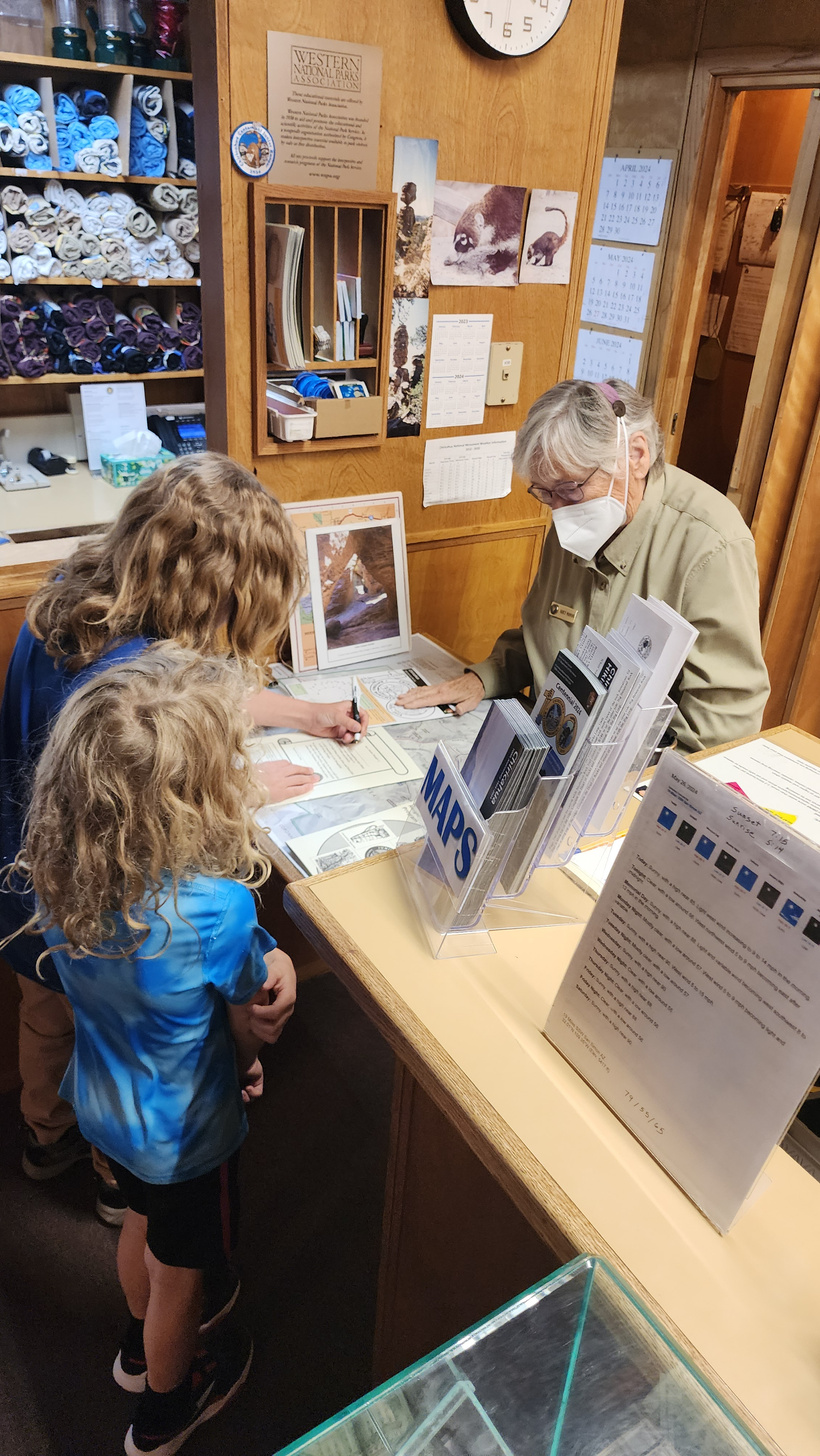 Jarek turned in his badge at the completion of our walk in the cave. Arya and Evan did not have their books finished until a couple days later, when we stopped by on our way to Guadalupe Mountains National park and they turned in their books and got their badges.