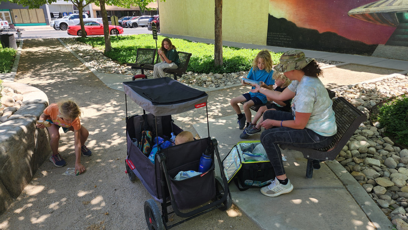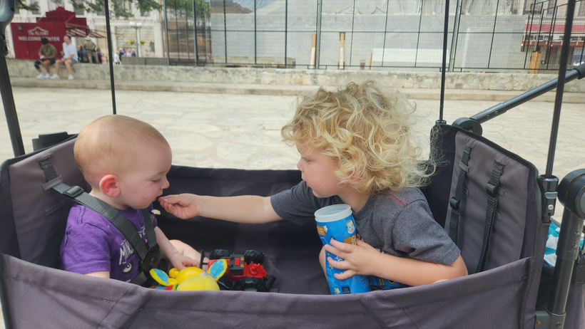 During lunch, Alan and I discussed doing the Discovery Tour with the kids, and we got four out of five on board. Randal and Garrett were up for another fun ride in their packs, Jarek was bouncing with excitement, Arya was enthusiastic, and Evan was a no. I told him to suck it up because the rest of us wanted to do it, and he did. Garrett, after moving a safe distance away, stealthily dropped a bomb in his pull-up. This was discovered only after a vigorous session of tag with his older brothers, at which point the pull-up’s capacity to contain the bomb was exceeded. After going through half a pack of wet-wipes and bagging up the stinky clothes, Garrett smelled much better and we bought our tickets for the Discovery Tour.