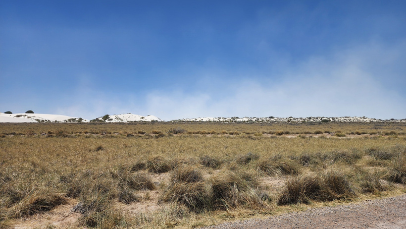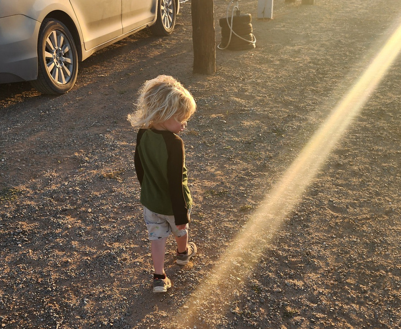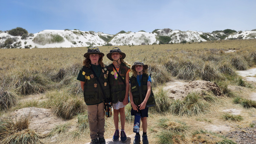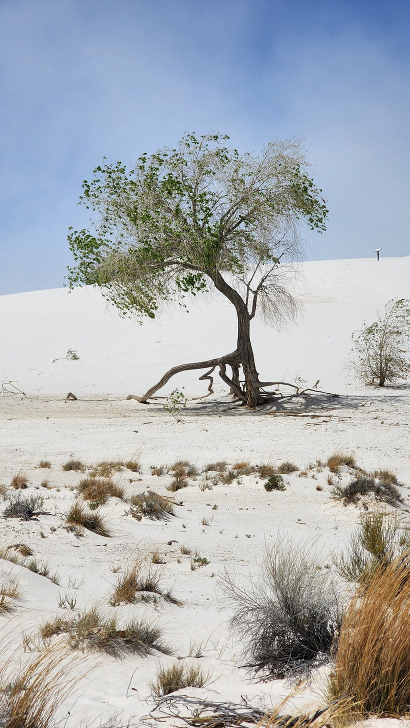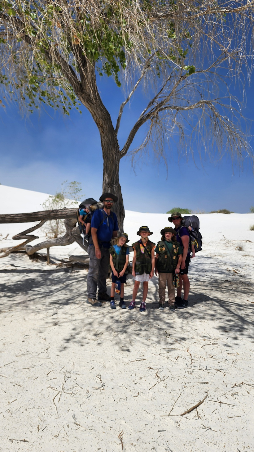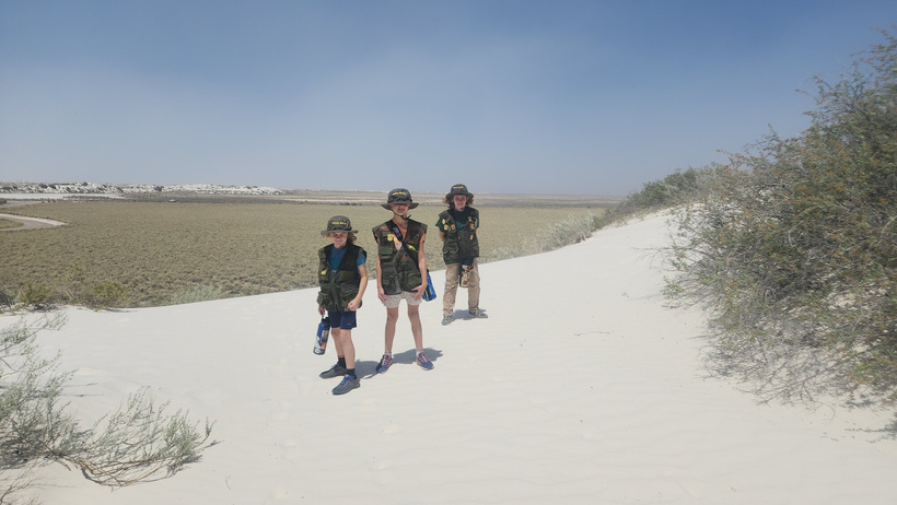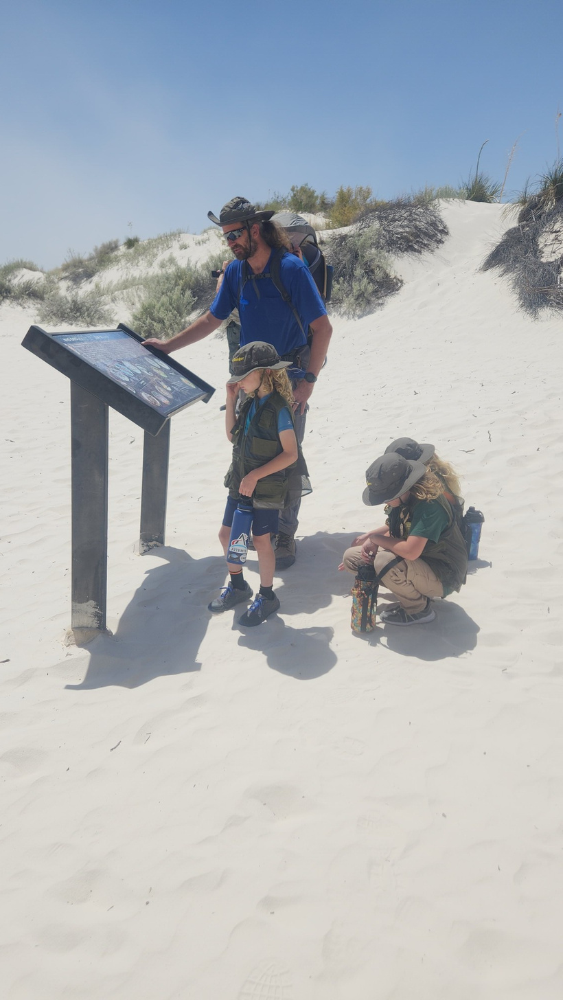 Posing on a crest for a photo with the blowing dust in the background, the kids did well in the soft gypsum sand of the dunes. The dunes can move as much as 30 feet or more in a year.