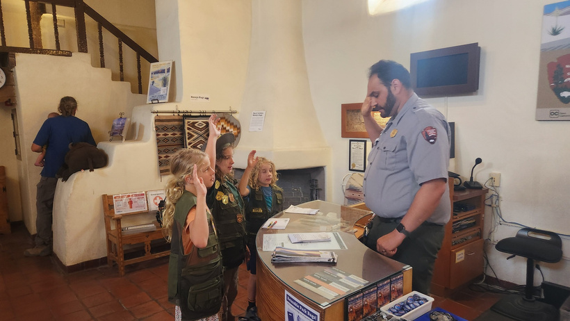 After our hike, we drove back to the Visitor Center and turned in their Junior Ranger workbooks. The kids happily added another badge to their collection.