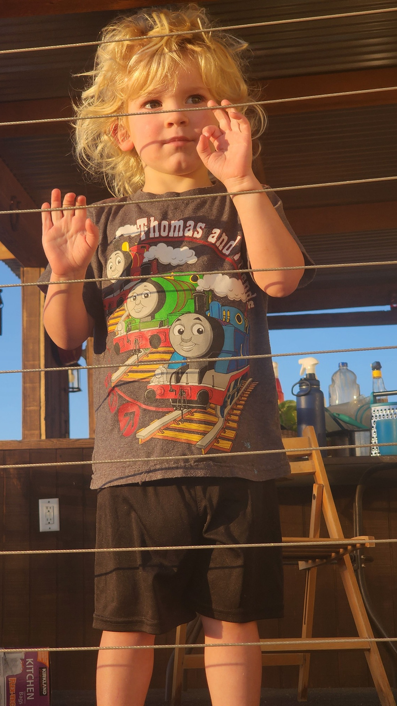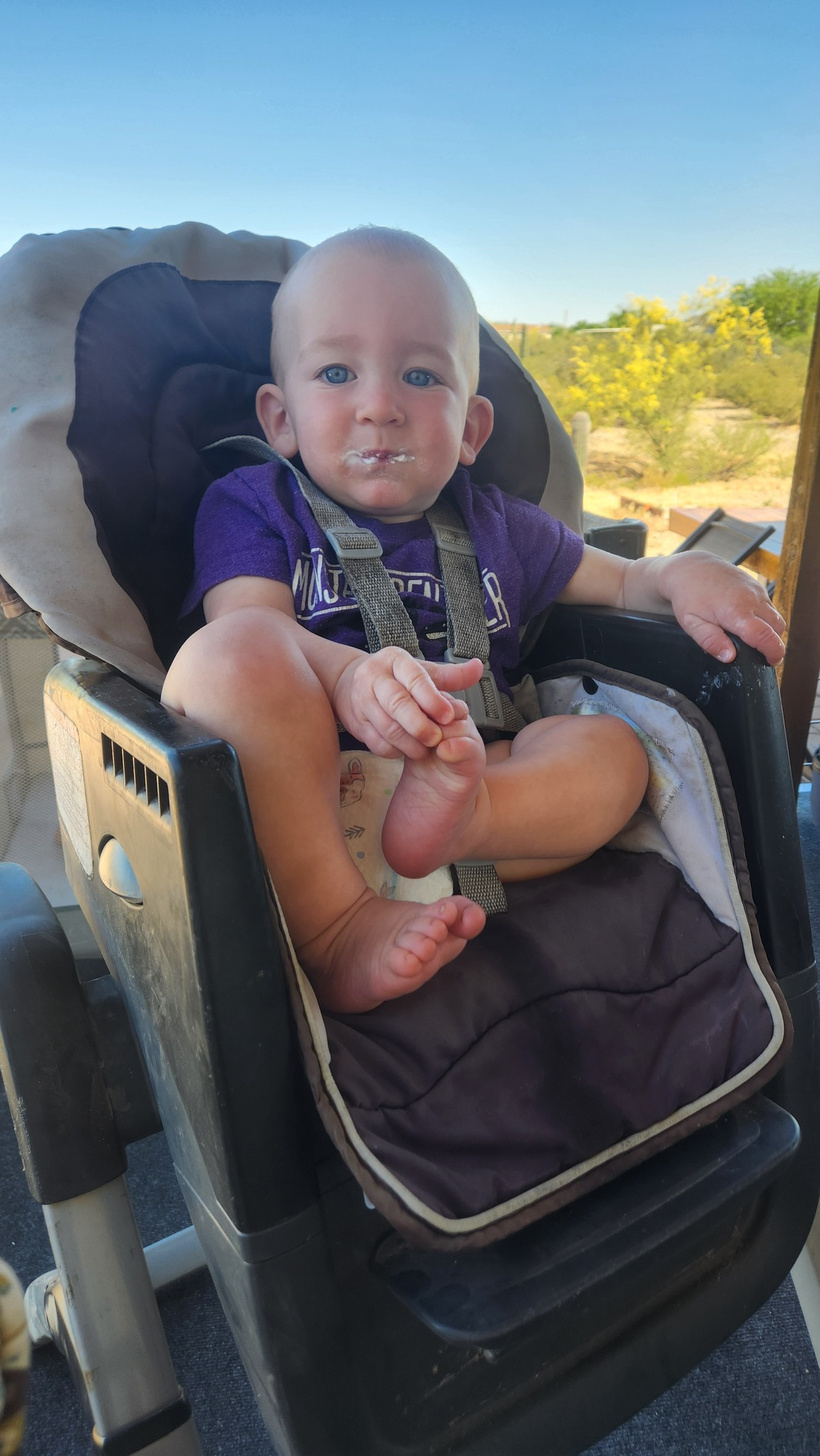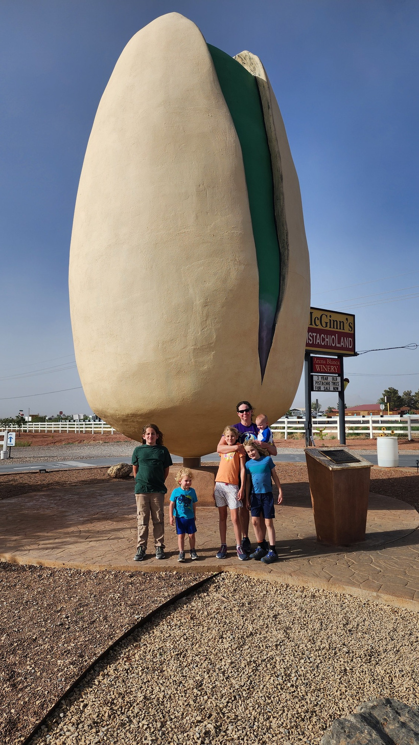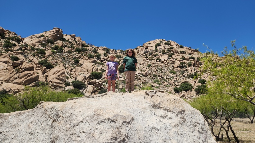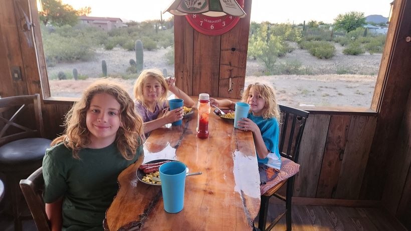Dinner on the back porch with the Saguaro cacti in the background. The kids were very excited about getting to be in a house, or perhaps, not the RV, for a little while. The biggest thing they were excited about was being able to take baths, followed by being able to run around.