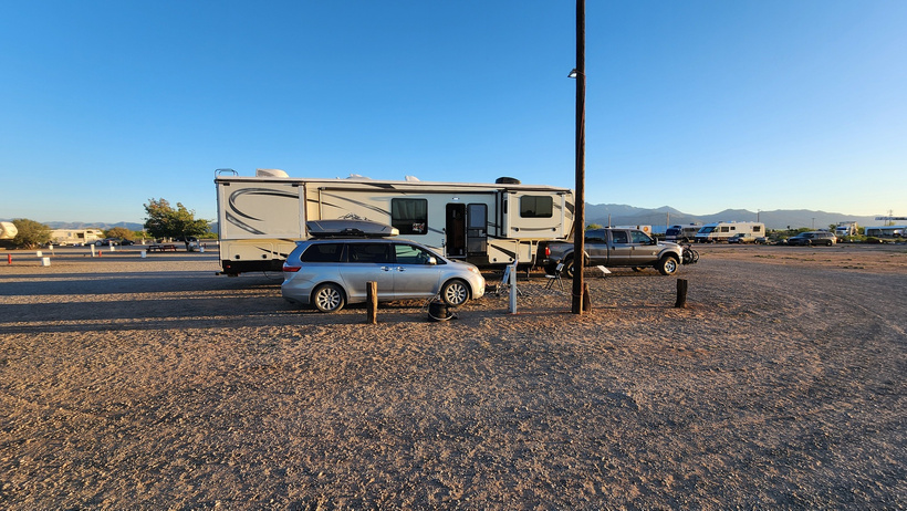 A view of our camp site at the Dave’s Mountain view Jerkey and RV camp ground. Typically Arizona, gravel, dirt, and mountains.