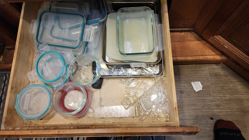 Our microwave glass tray did not survive the trip. It finally yeeted its last. It had yeeted out of the microwave several times, but it had survived. This time, it did not, and it took out several other glass dishes from the drawer below the oven, which tended to slide open during travel.
