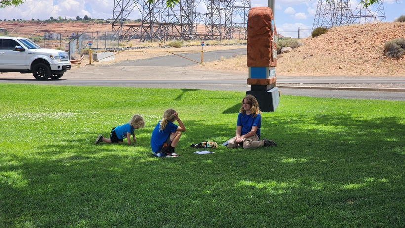 Taking a break from the heat. The kids were coloring and journaling in the shade. The blue cube is a misting fan we picked up to help combat the heat in the dry air.