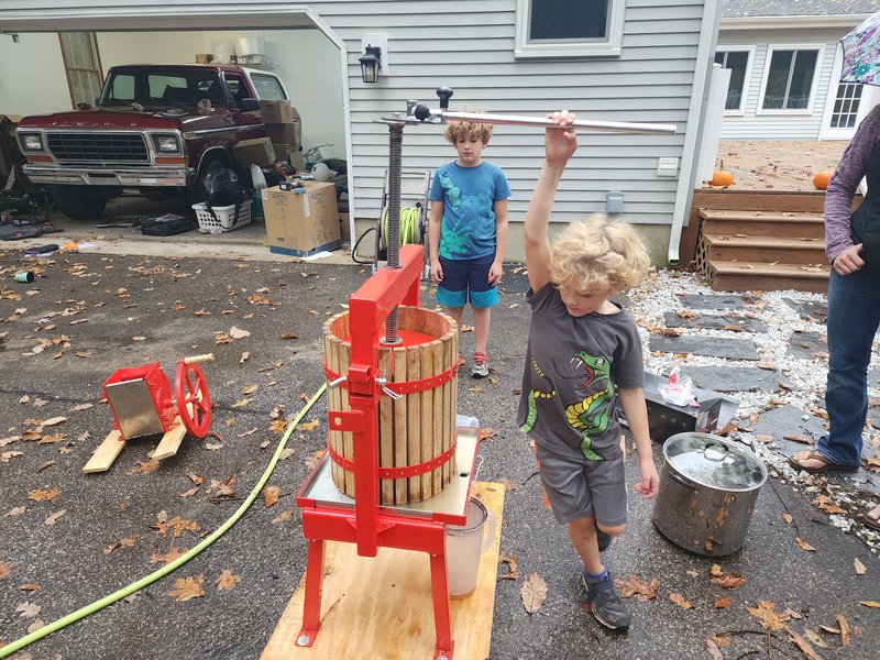 Our friend and fellow Cub Scout, B, pressing his apples.